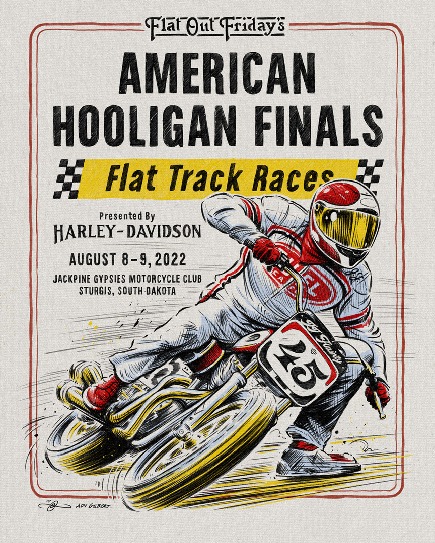 Flat Track illustration for the American Hooligan Finals poster 2022 by Adi Gilbert. Commissioned by Flat Out Friday / Harley-Davidson