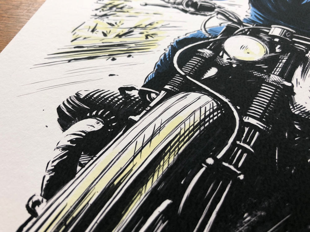 A drawing of Brendan Fairclough aboard his BMW R80 inspired by the title sequence of his film Deathgrip (Clay Porter). Private Commission