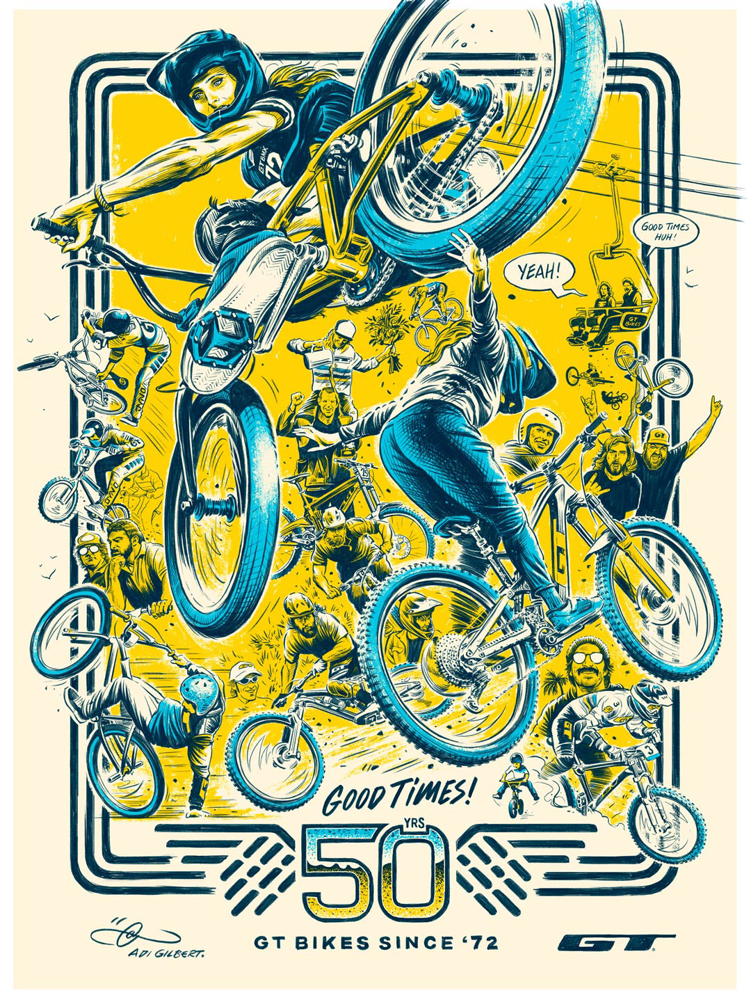 Poster design and illustration for GT Bikes 50 years of Good Times celebration. This was a super fun piece to draw. Thanks to everyone at GT for the opportunity.