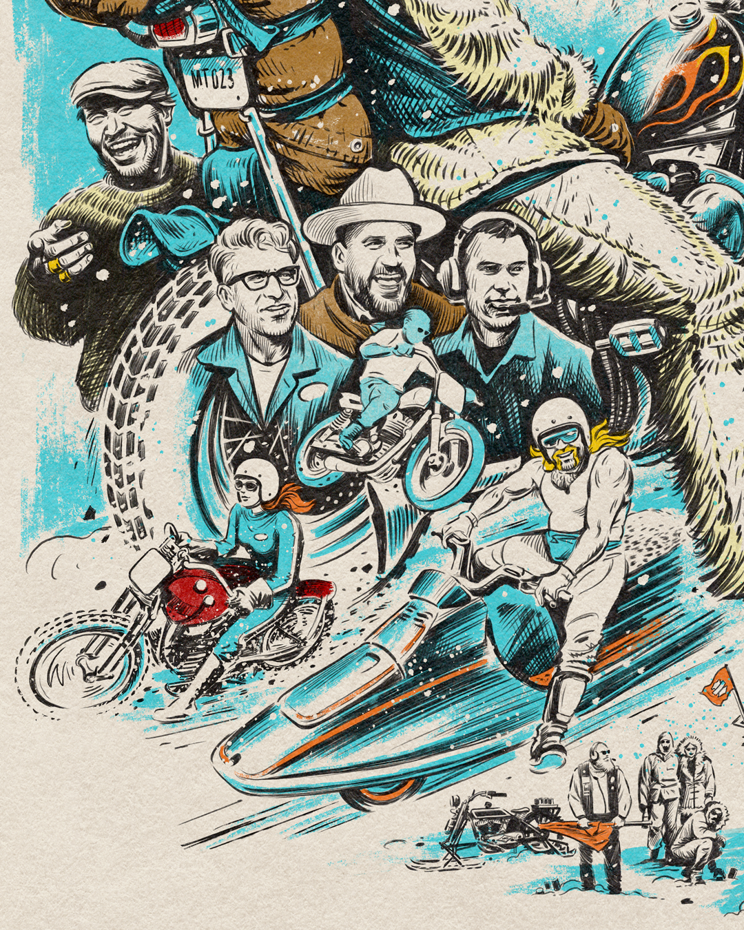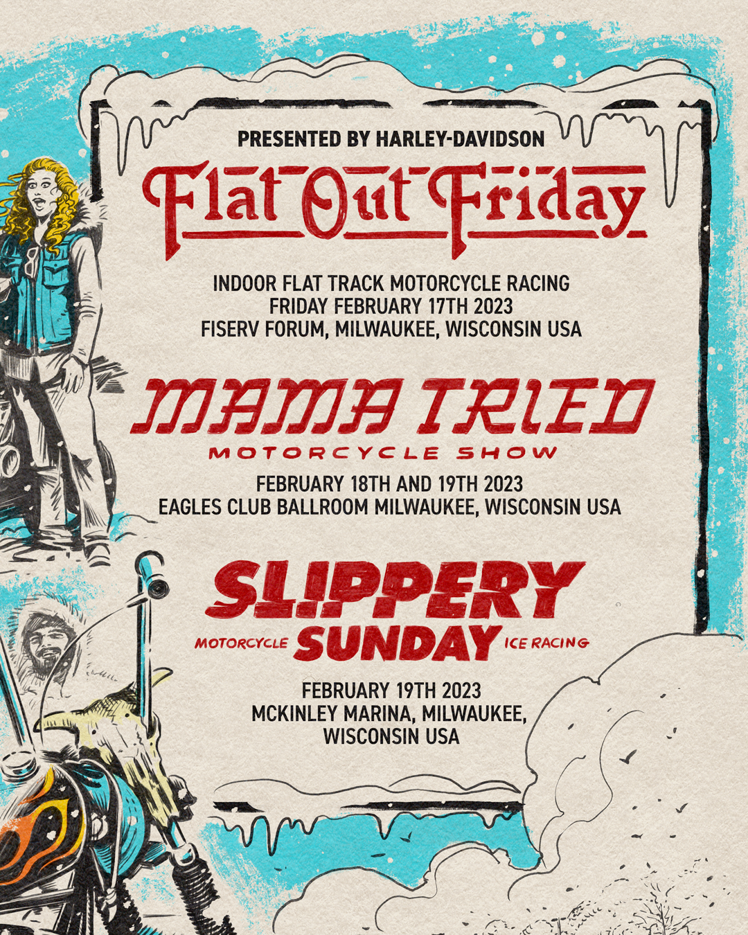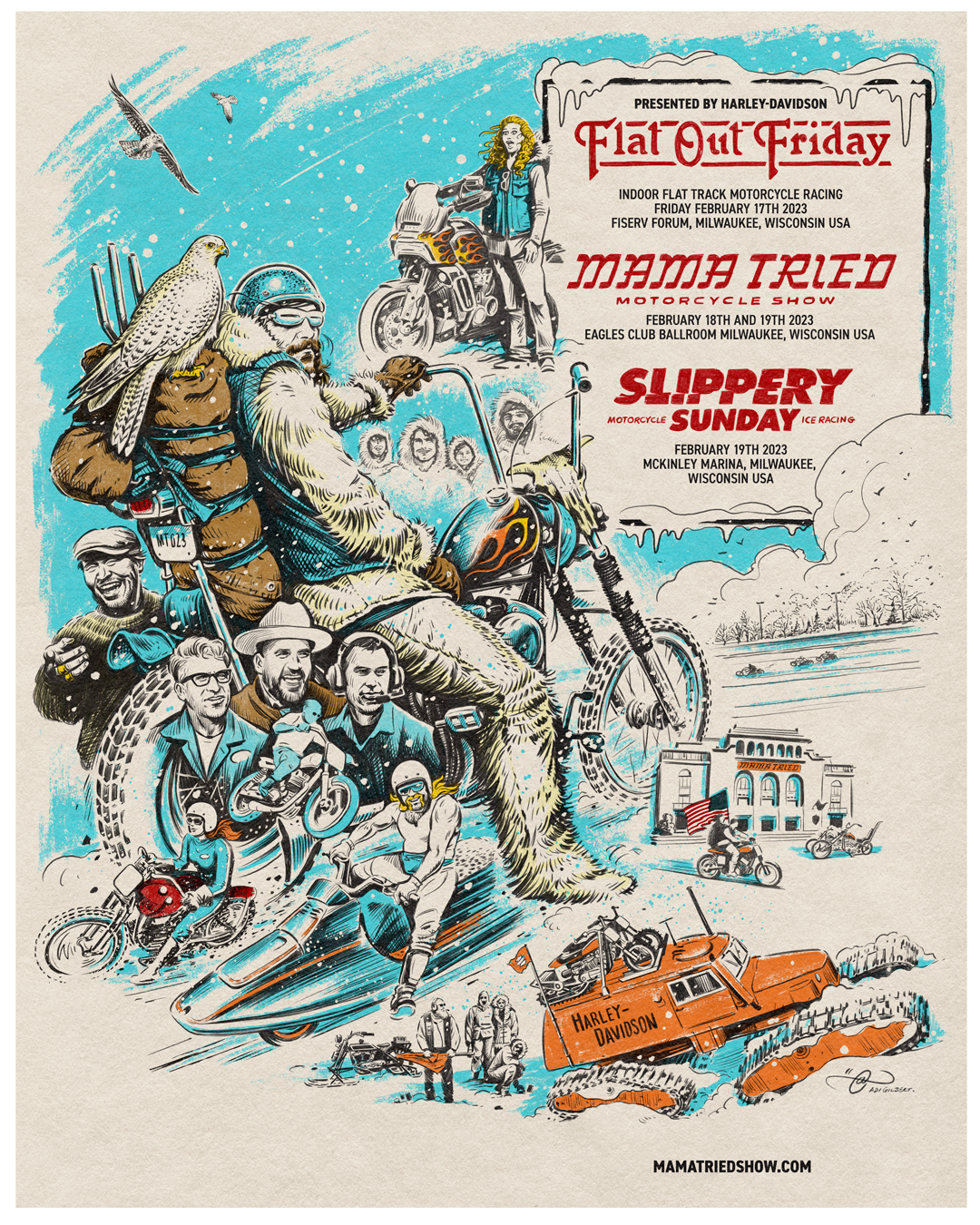 Poster for the 2023 Mama Tried, Flat Out Friday & Slippery Sunday motorcycle trinity. Loads of fun drawing this one. © Adi Gilbert / 99seconds.com
