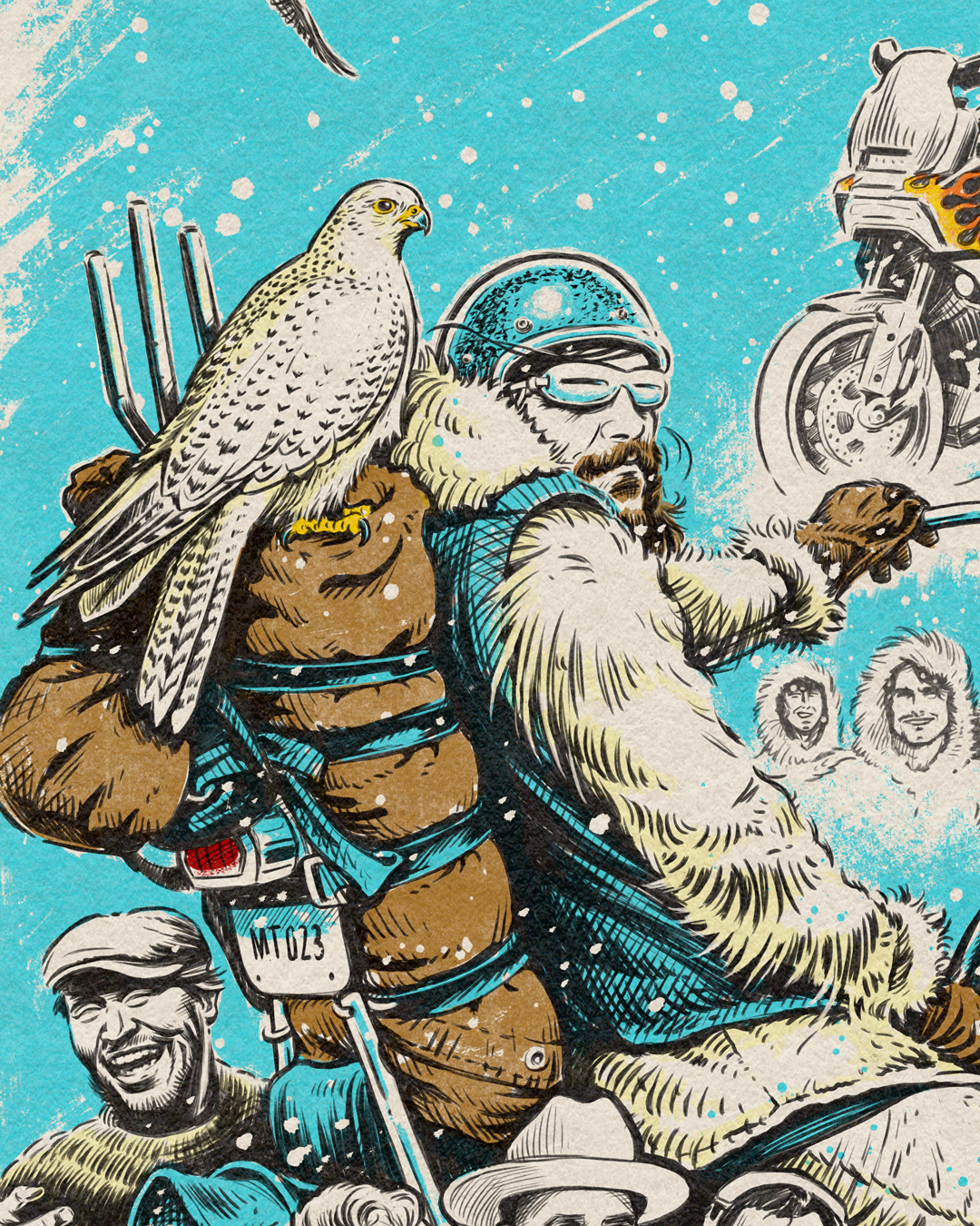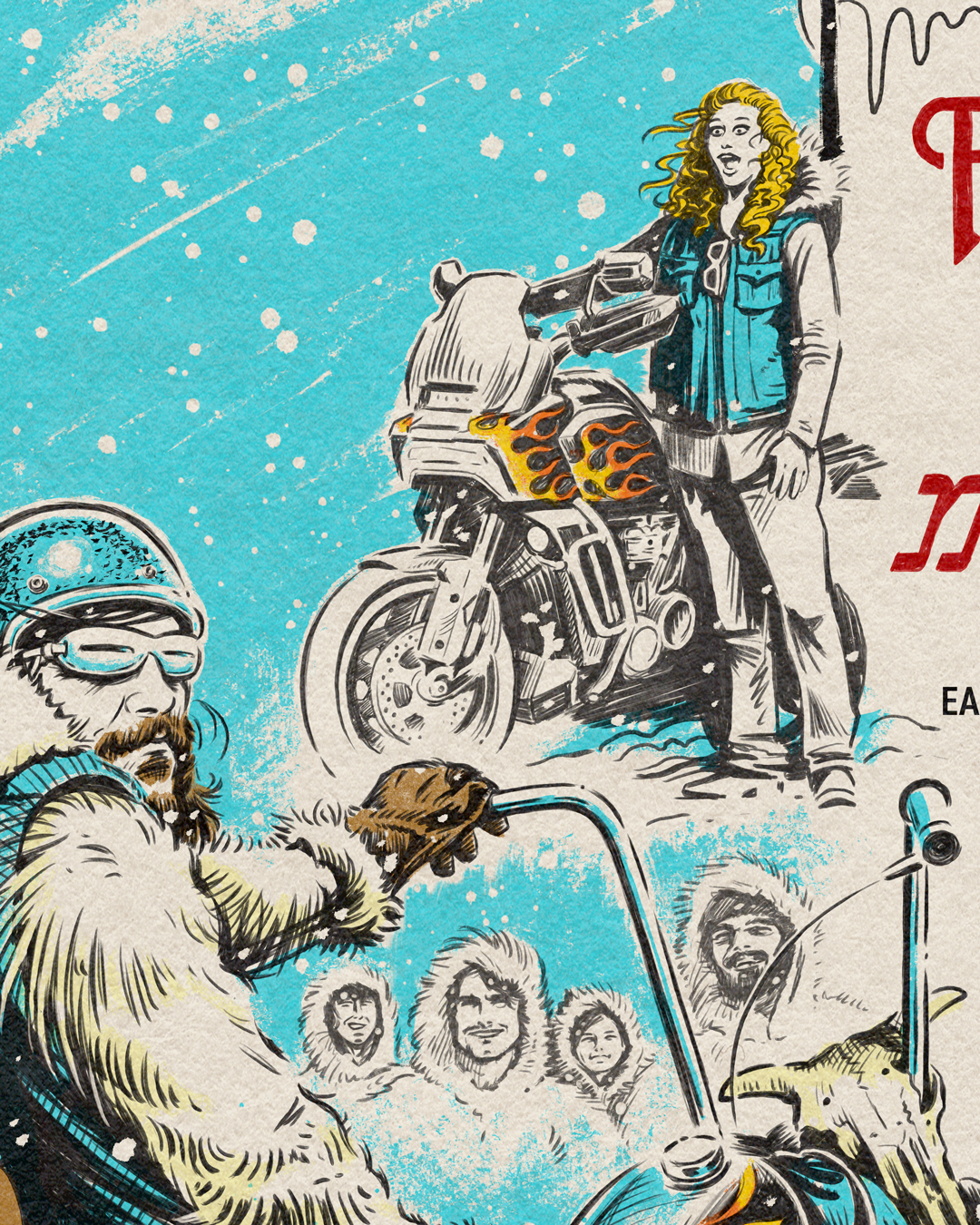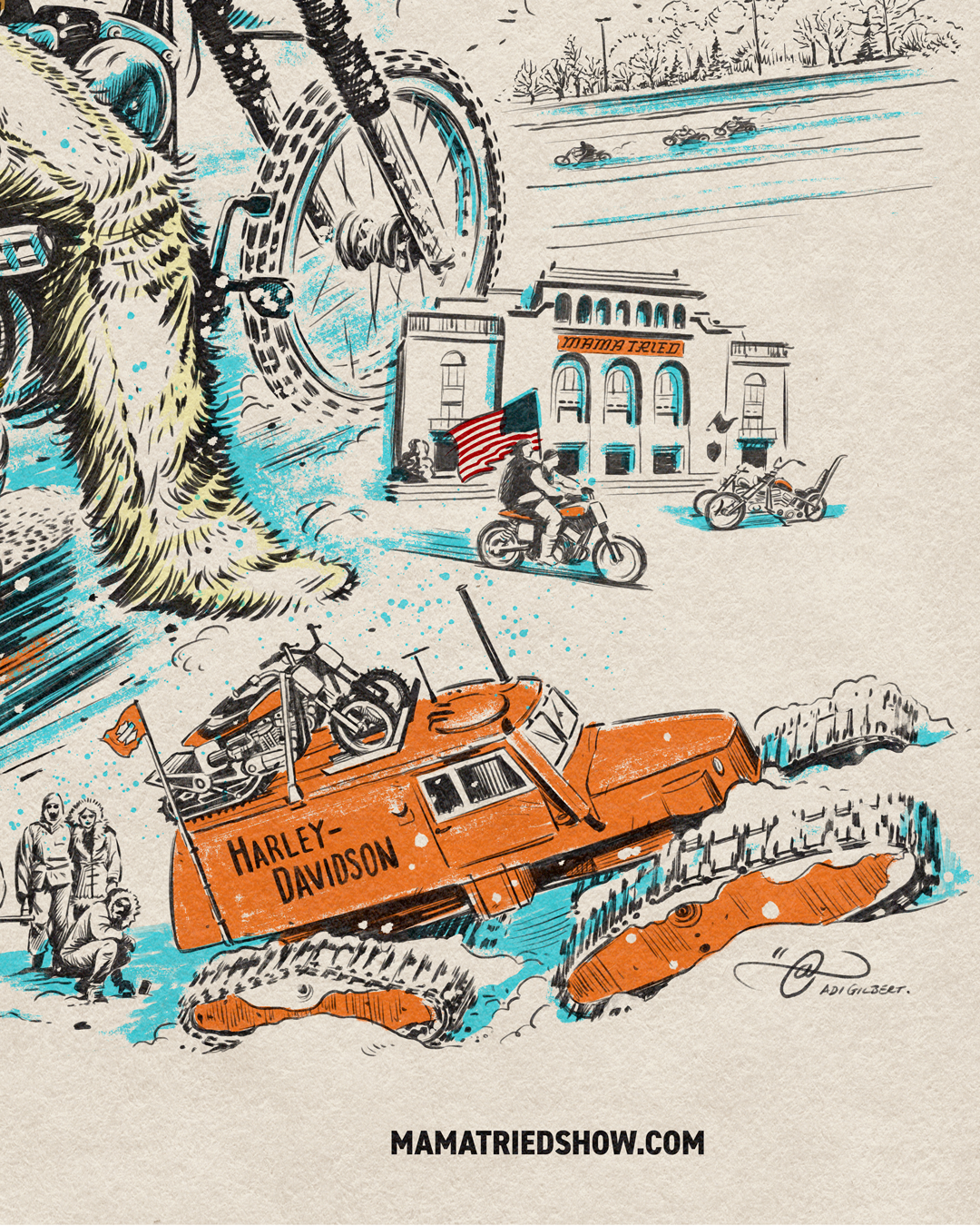 Poster for the 2023 Mama Tried, Flat Out Friday & Slippery Sunday motorcycle trinity. Loads of fun drawing this one. © Adi Gilbert / 99seconds.com