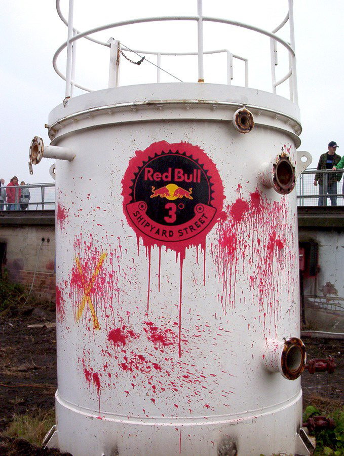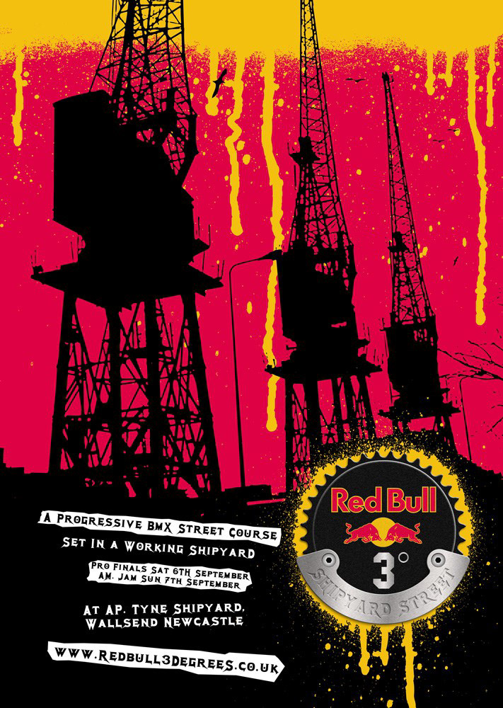 A series of promotional artwork for the Red Bull 3 Degrees BMX competition. Held in a disused Newcastle shipyard, the event was designed to be gritty and grimy, an event for BMXers rather than the public in general. Aswell as the event ID and promotional materials we also exectued the onsite branding and generally made a mess (as per the brief). This work was done in conjunction with the good people at Freewheelin’ Media.