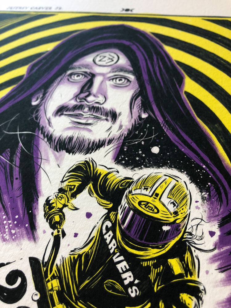 An illustration of flat track motorcycle racer Jeffrey Carver Jr aka “The Wizard”. Done for issue 32 of Sideburn Magazine. Please support the independents and buy a magazine if you can. This was great fun to research and draw. Jeffrey certainly has an individual and inspiring approach to life and racing. Please check out his website if you can.